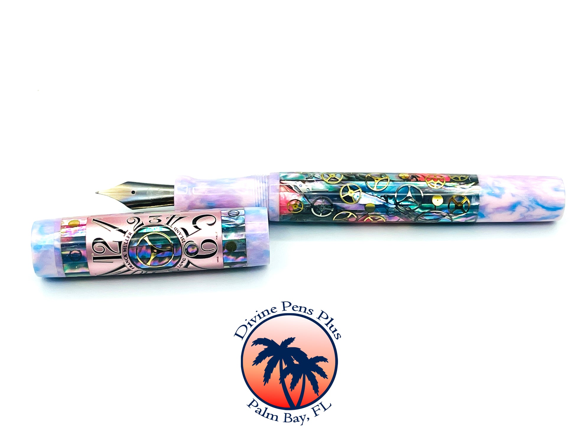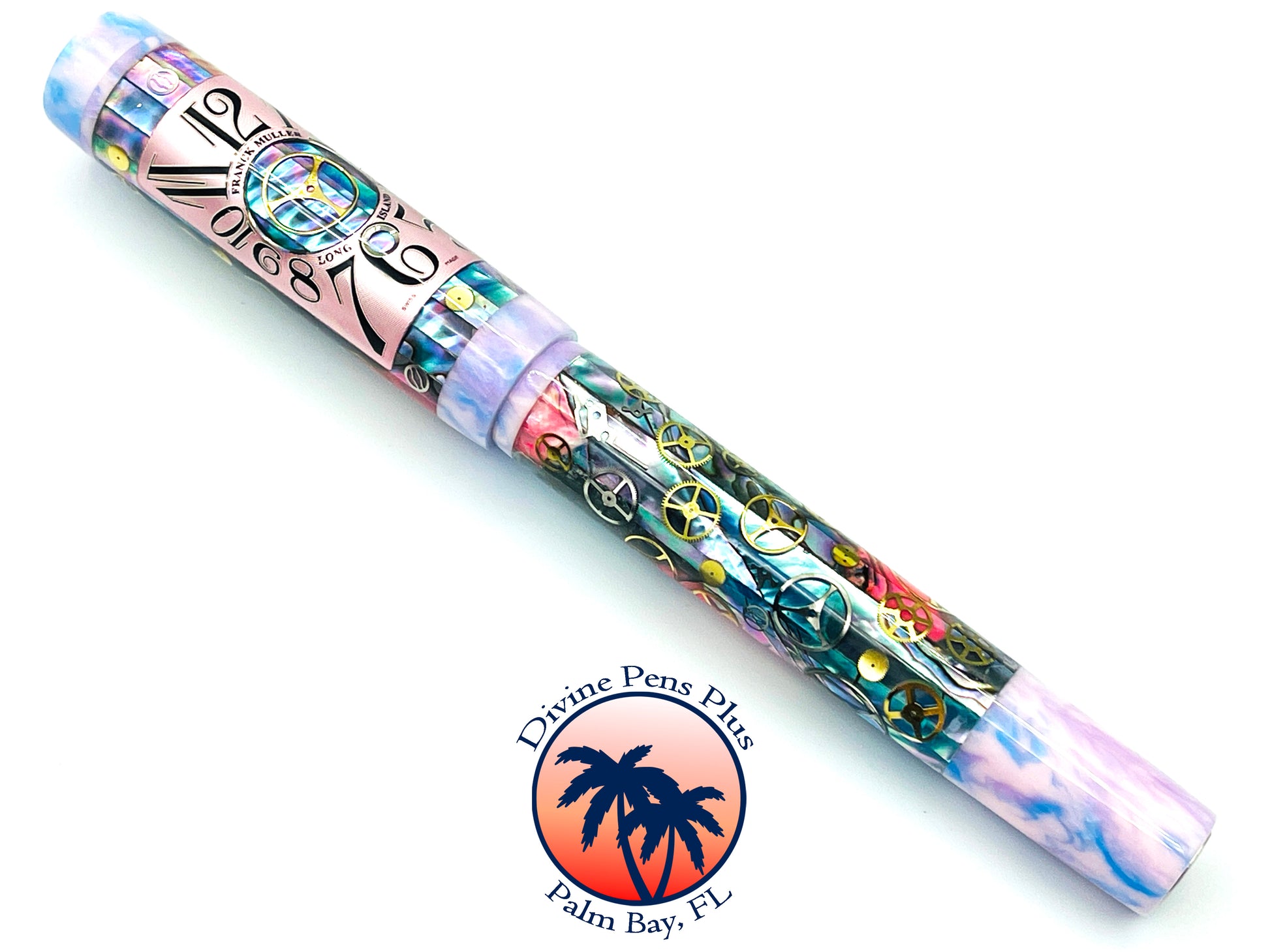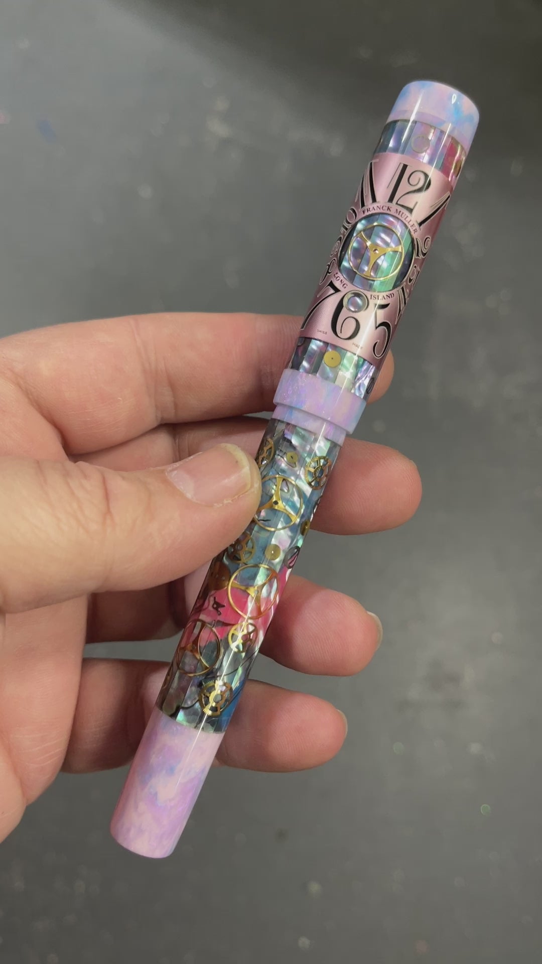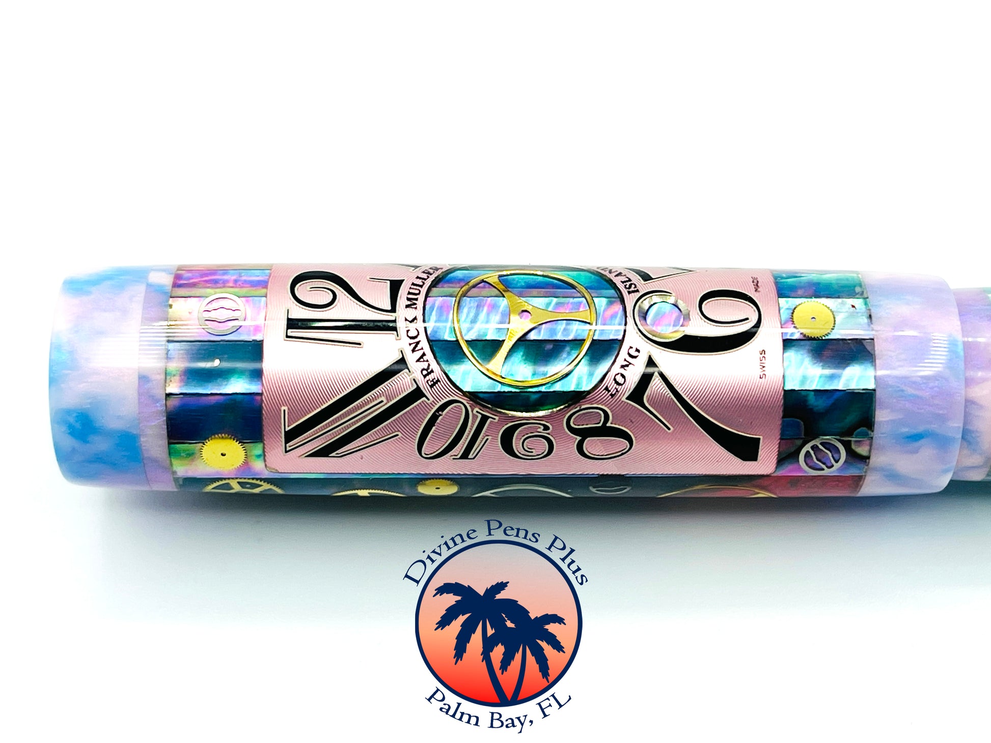 This one is an absolute beauty! The body and cap are custom cast watch parts featuring an actual pink Franck Mueller watch face and multi-colored abalone background. The section, finial caps and center bands are made with our "Reef" in-house resin mix that features soft pink, purple, and blue pearlescent swirls. Fitted with a custom titanium clip and watch gear engraved nickel silver cabochon on the cap finial and logo engraved nickel silver cabochon on the body finial. Fitted for our branded Bock no. 6 nib, with many nib widths available. Pen comes with one standard international converter.