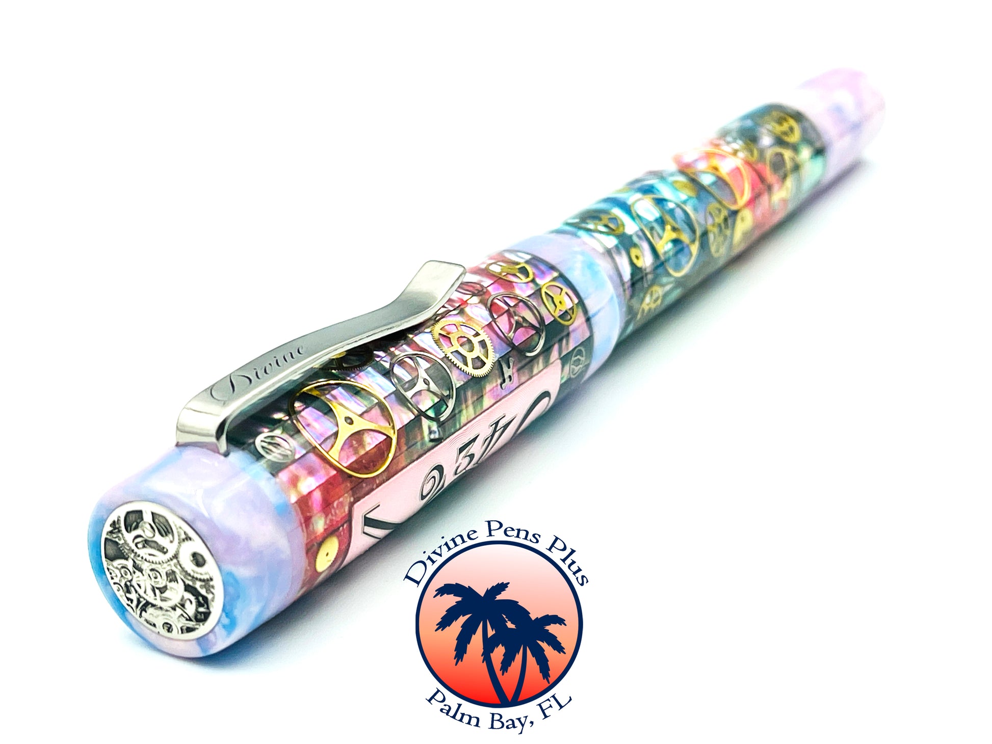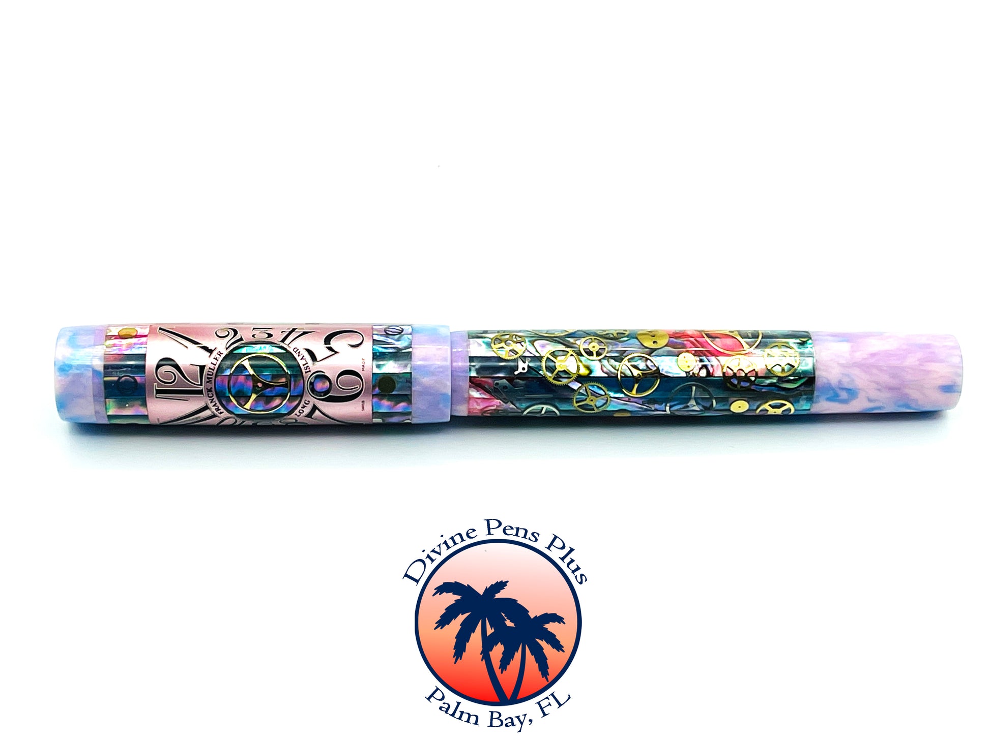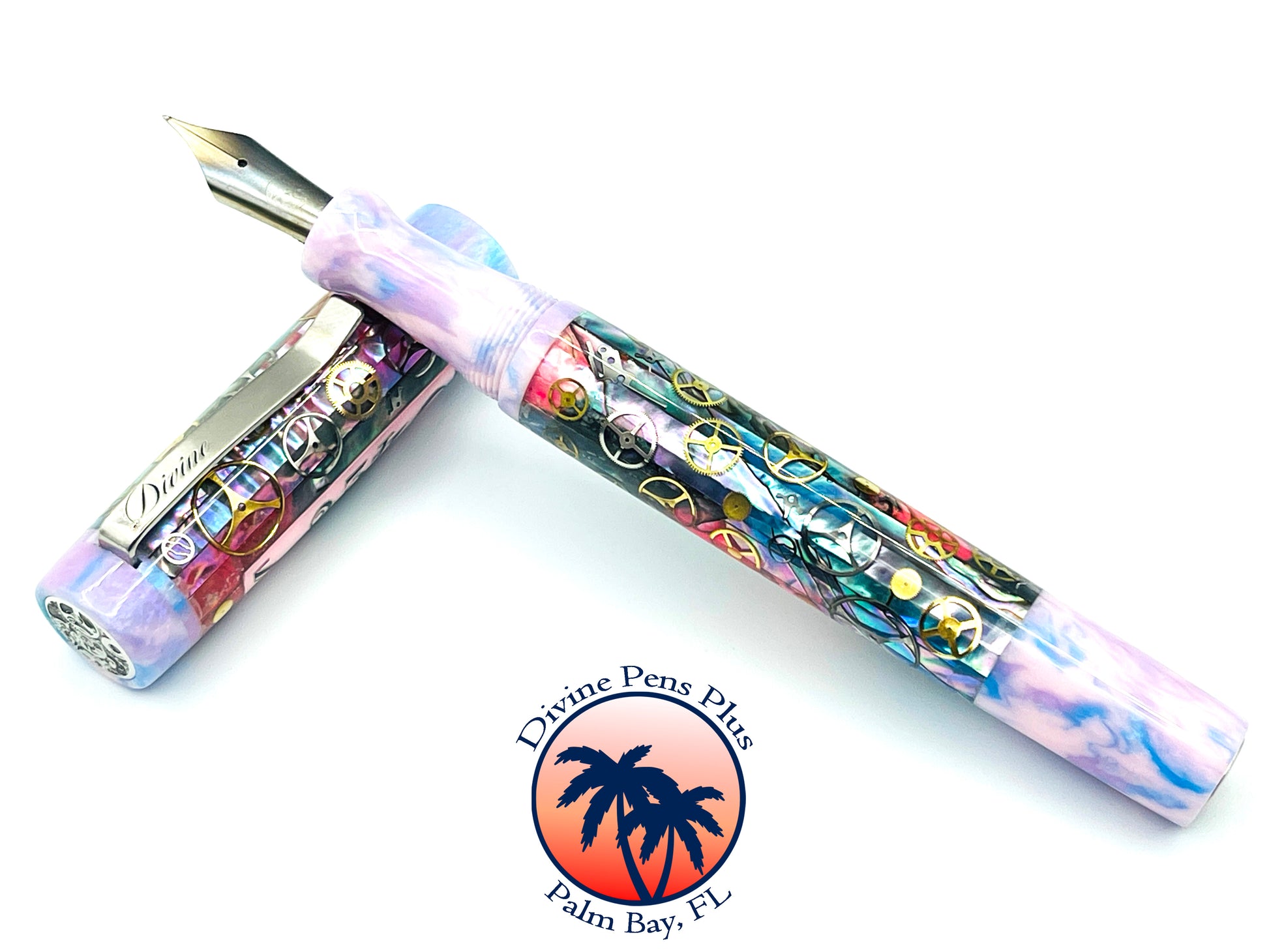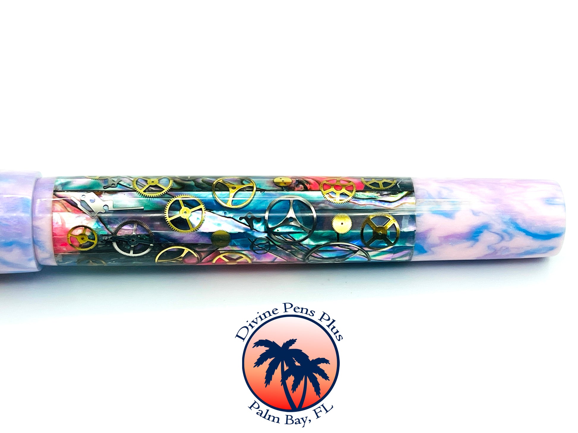 This one is an absolute beauty! The body and cap are custom cast watch parts featuring an actual pink Franck Mueller watch face and multi-colored abalone background. The section, finial caps and center bands are made with our "Reef" in-house resin mix that features soft pink, purple, and blue pearlescent swirls. Fitted with a custom titanium clip and watch gear engraved nickel silver cabochon on the cap finial and logo engraved nickel silver cabochon on the body finial. Fitted for our branded Bock no. 6 nib, with many nib widths available. Pen comes with one standard international converter.