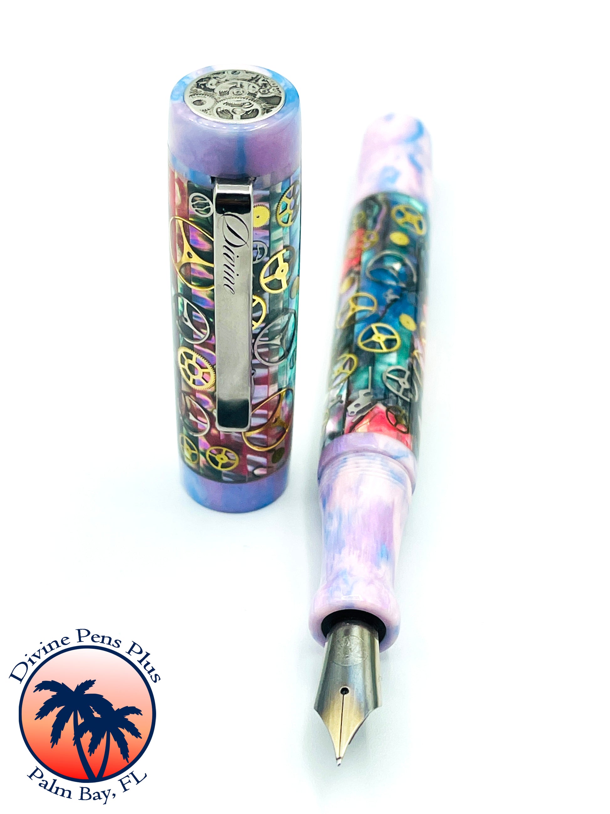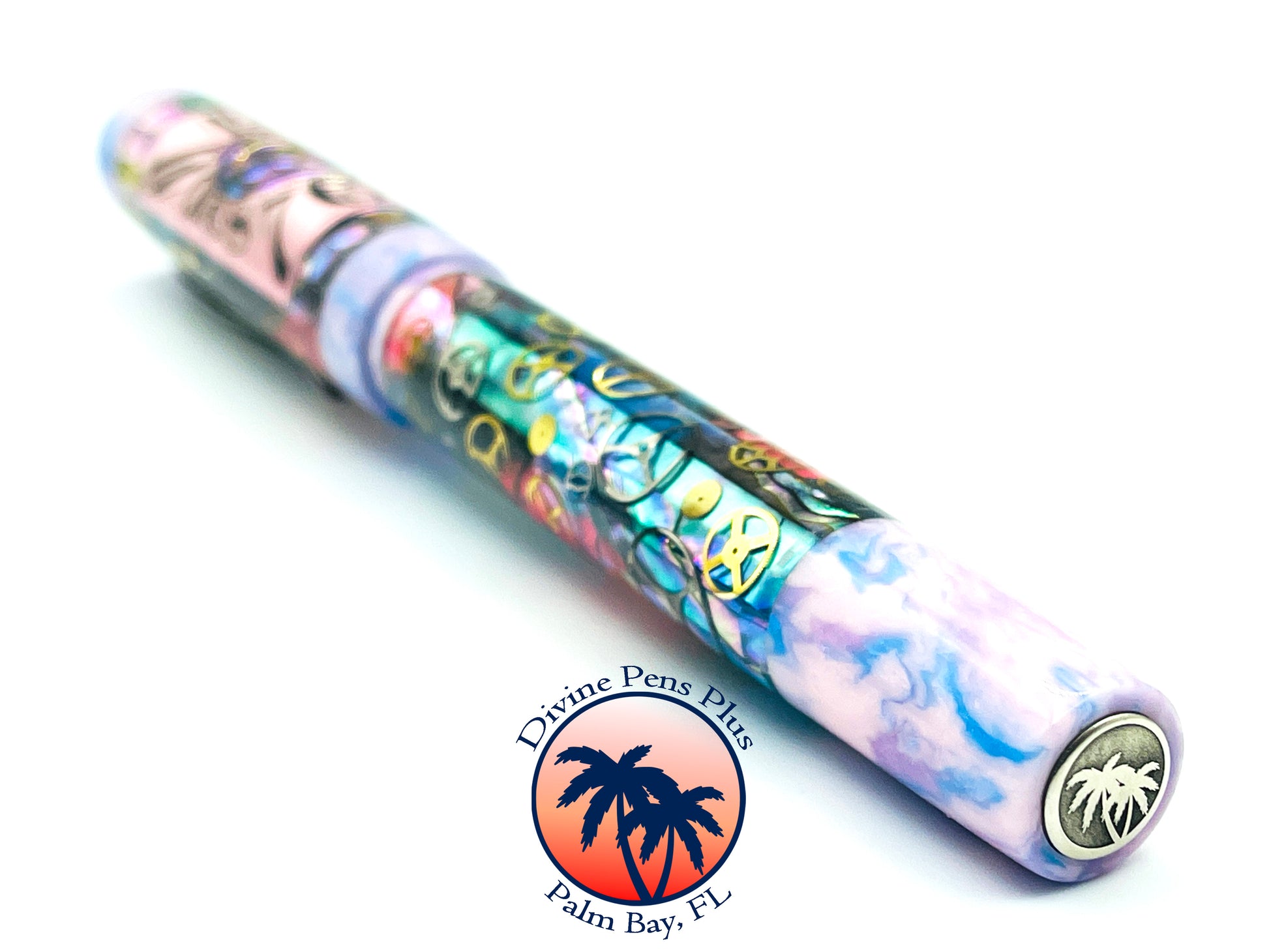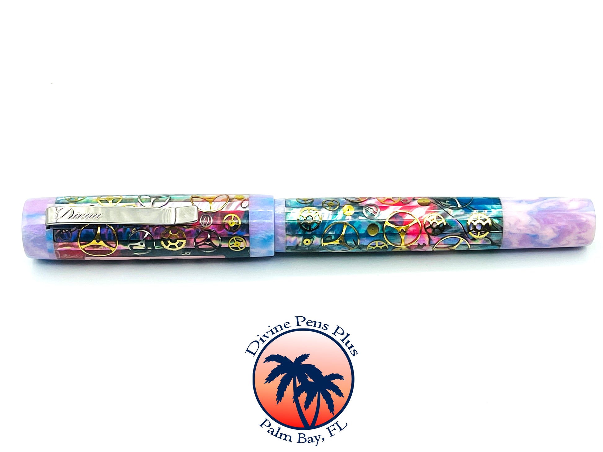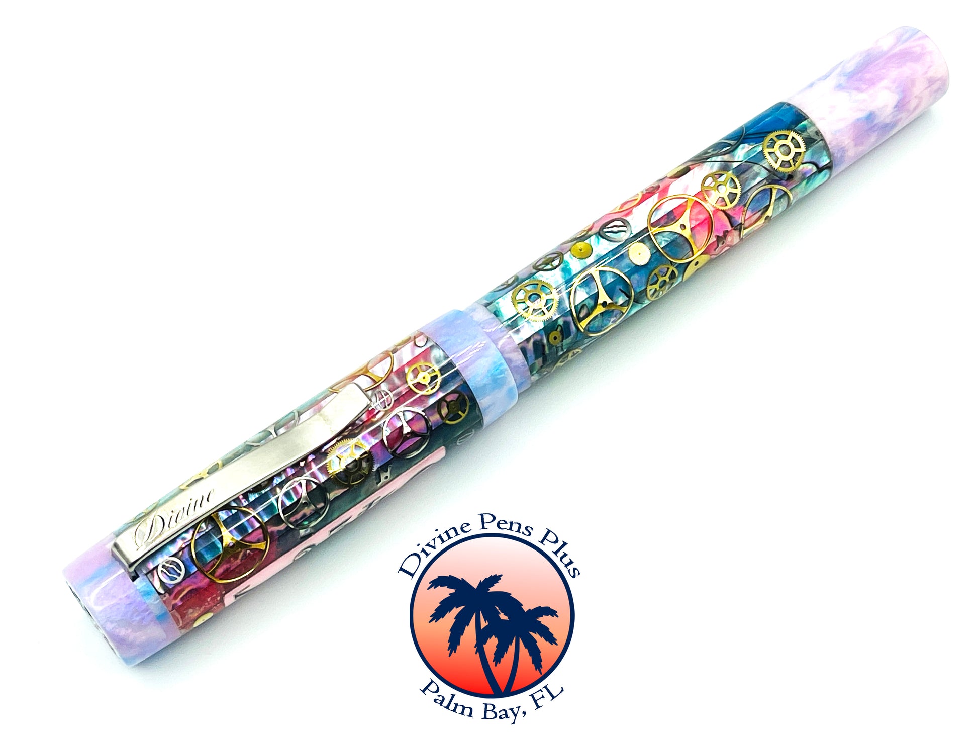 This one is an absolute beauty! The body and cap are custom cast watch parts featuring an actual pink Franck Mueller watch face and multi-colored abalone background. The section, finial caps and center bands are made with our "Reef" in-house resin mix that features soft pink, purple, and blue pearlescent swirls. Fitted with a custom titanium clip and watch gear engraved nickel silver cabochon on the cap finial and logo engraved nickel silver cabochon on the body finial. Fitted for our branded Bock no. 6 nib, with many nib widths available. Pen comes with one standard international converter.