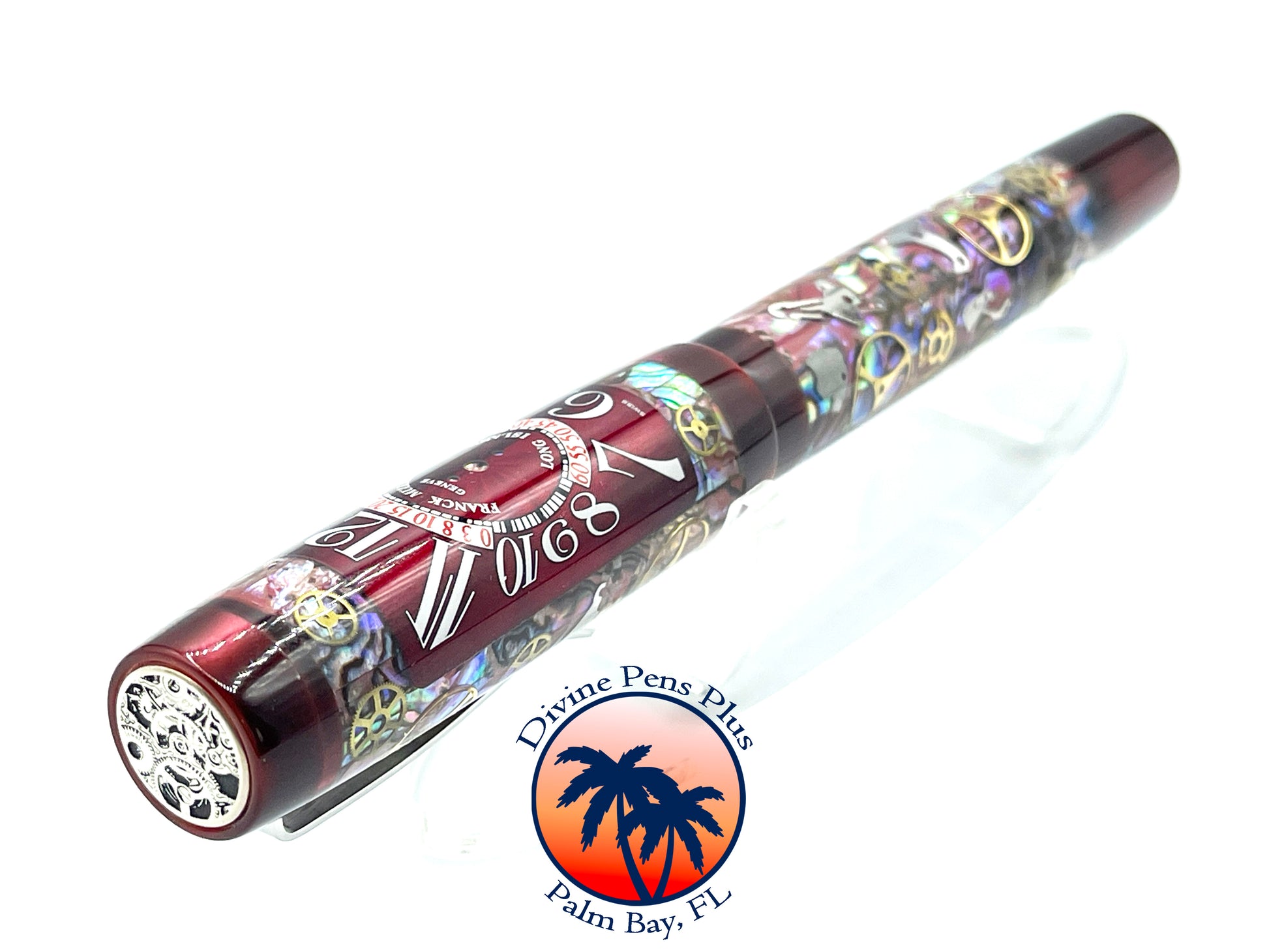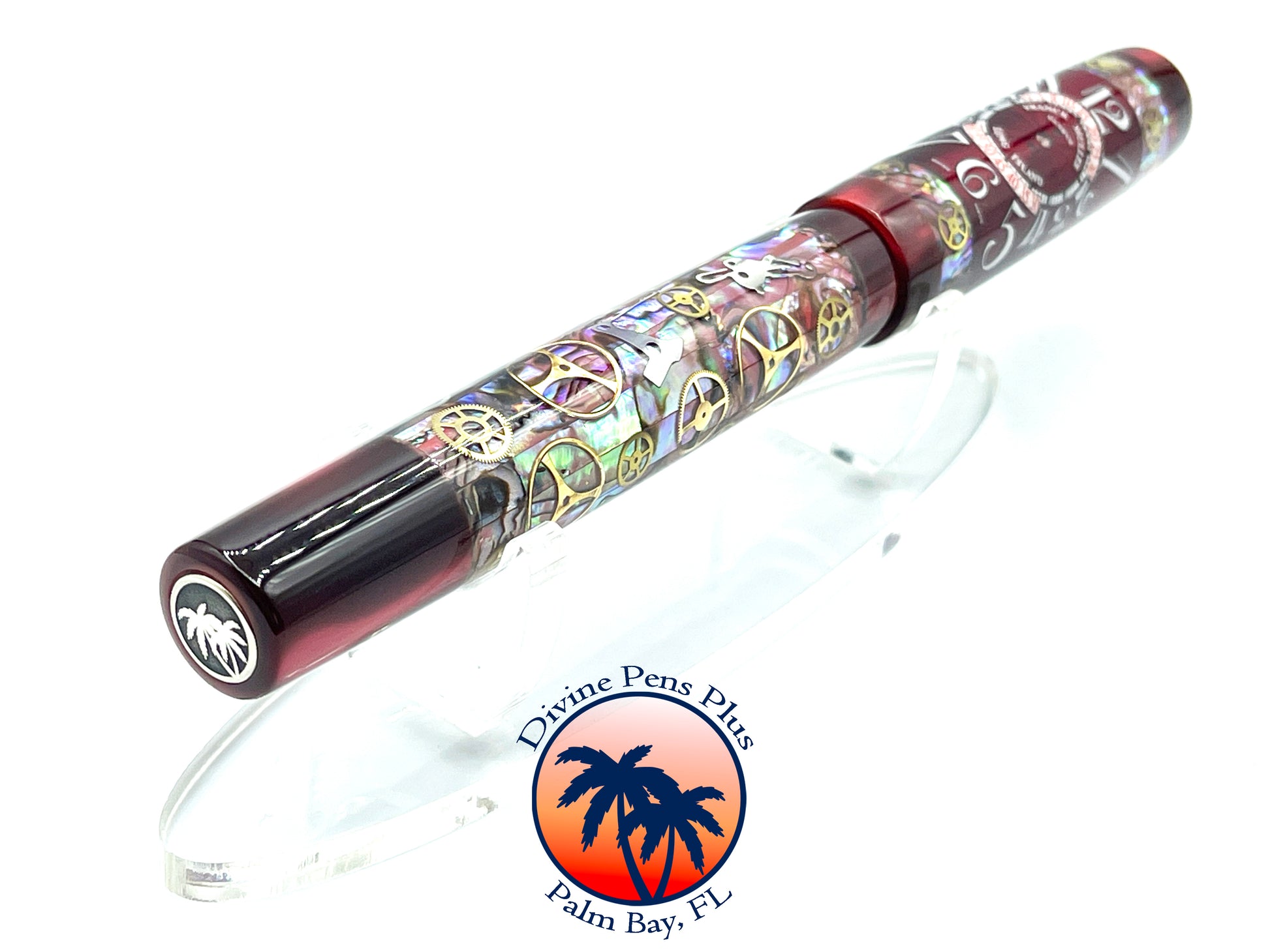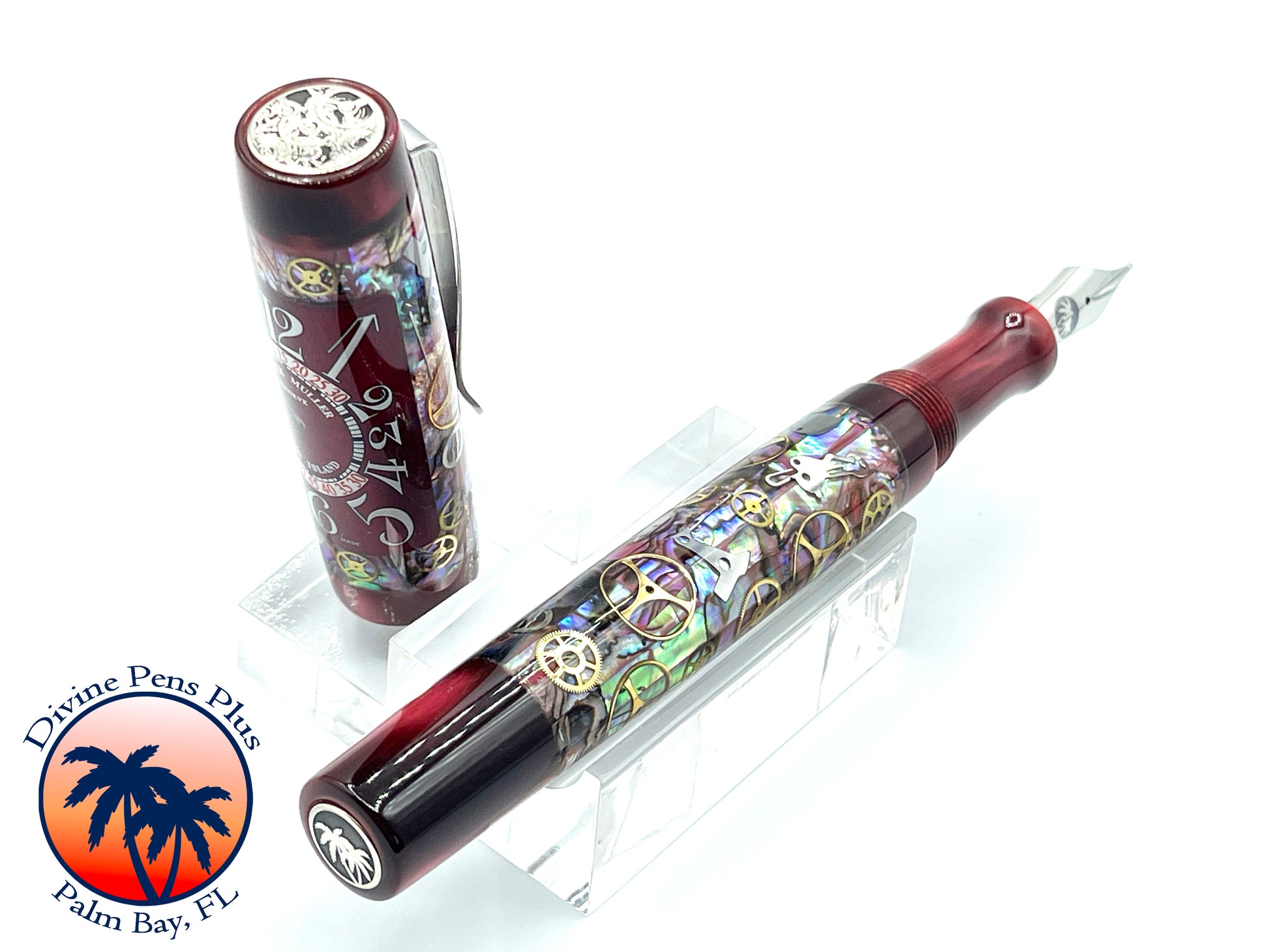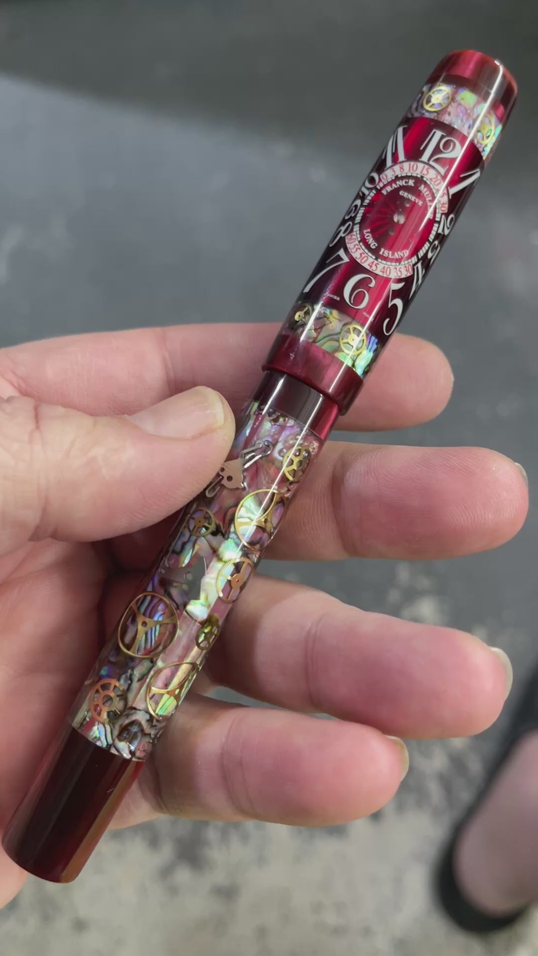 This one is a stunner and personal favorite! The body and cap are custom cast watch parts featuring an actual maroon Franck Mueller watch face and multi-colored abalone background. The section, finial caps and center bands are made with a resin mix called "Red Sky @ Night" from Pourly Controlled. Fitted with a custom stainless steel clip and watch gear engraved nickel silver cabochon on the cap finial and logo engraved nickel silver cabochon on the body finial. Fitted for our branded Bock no. 6 nib, with many nib widths available. Pen comes with one standard international converter. Check out the details of this pen in the video!