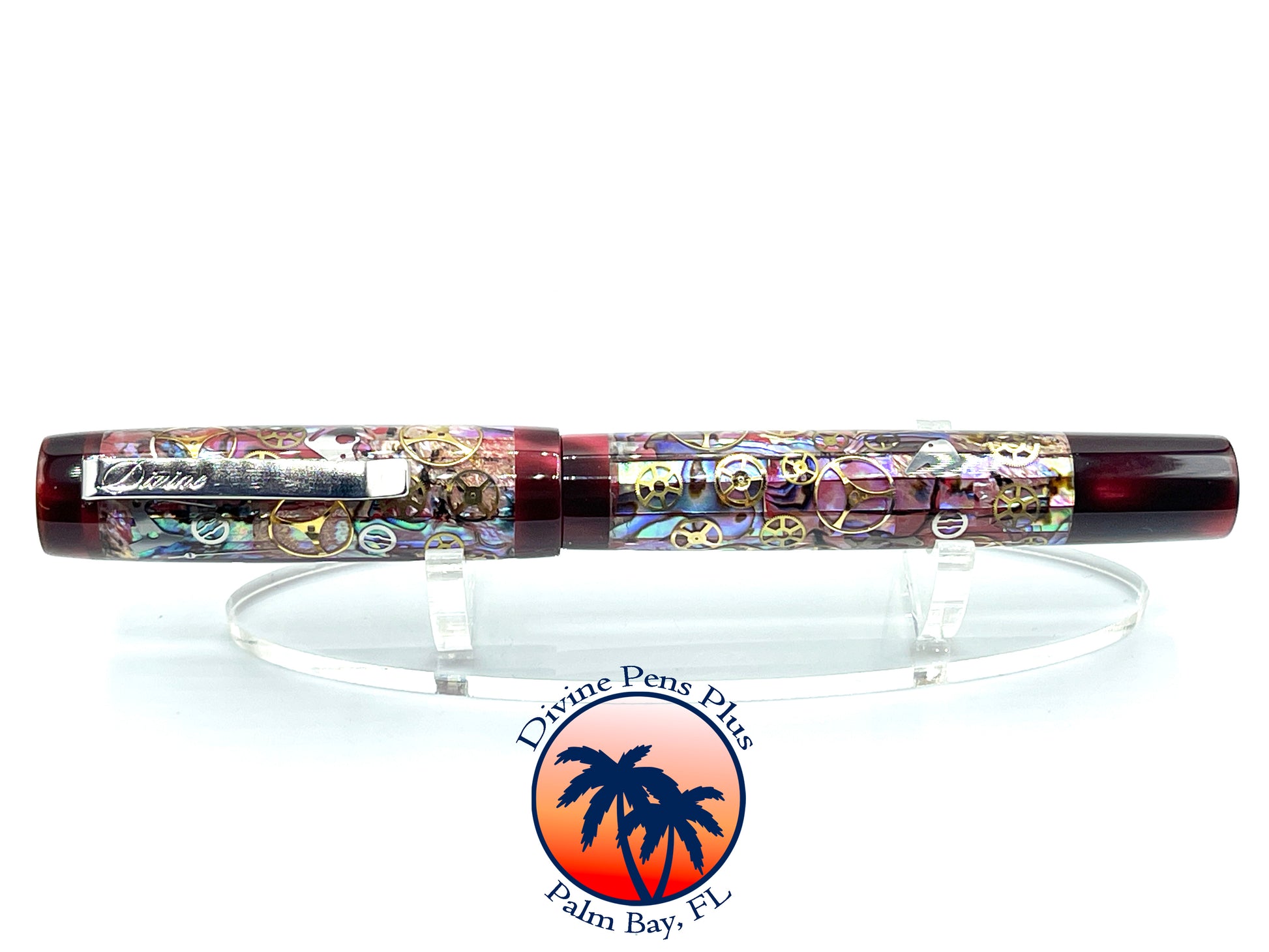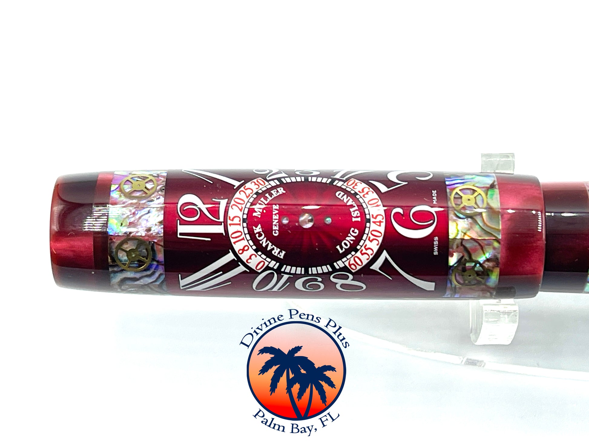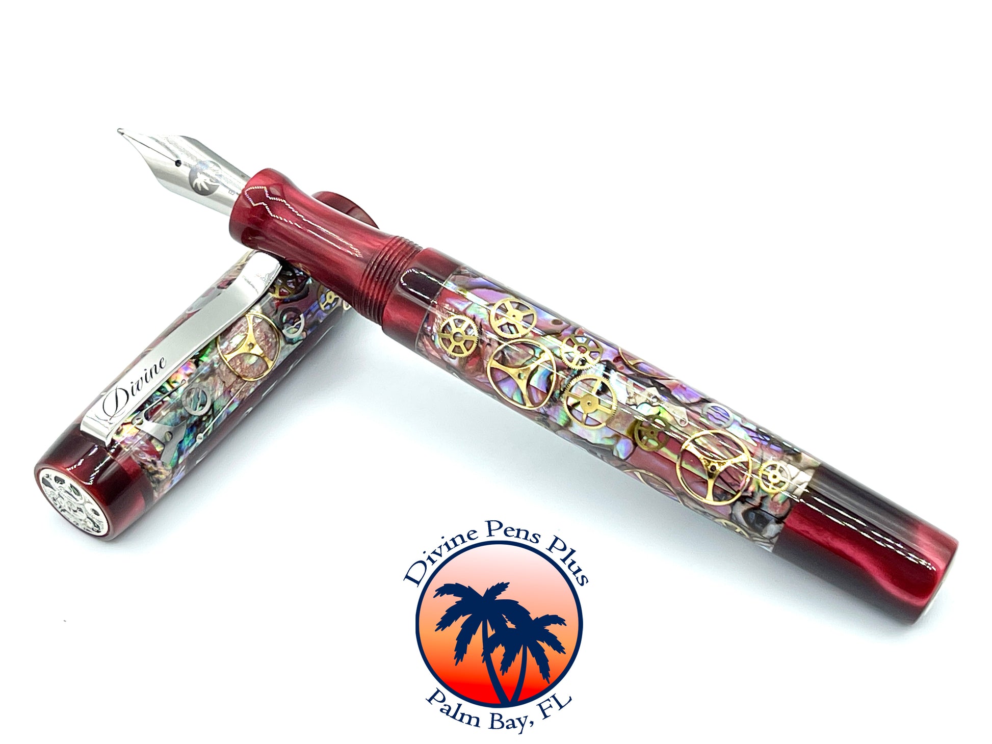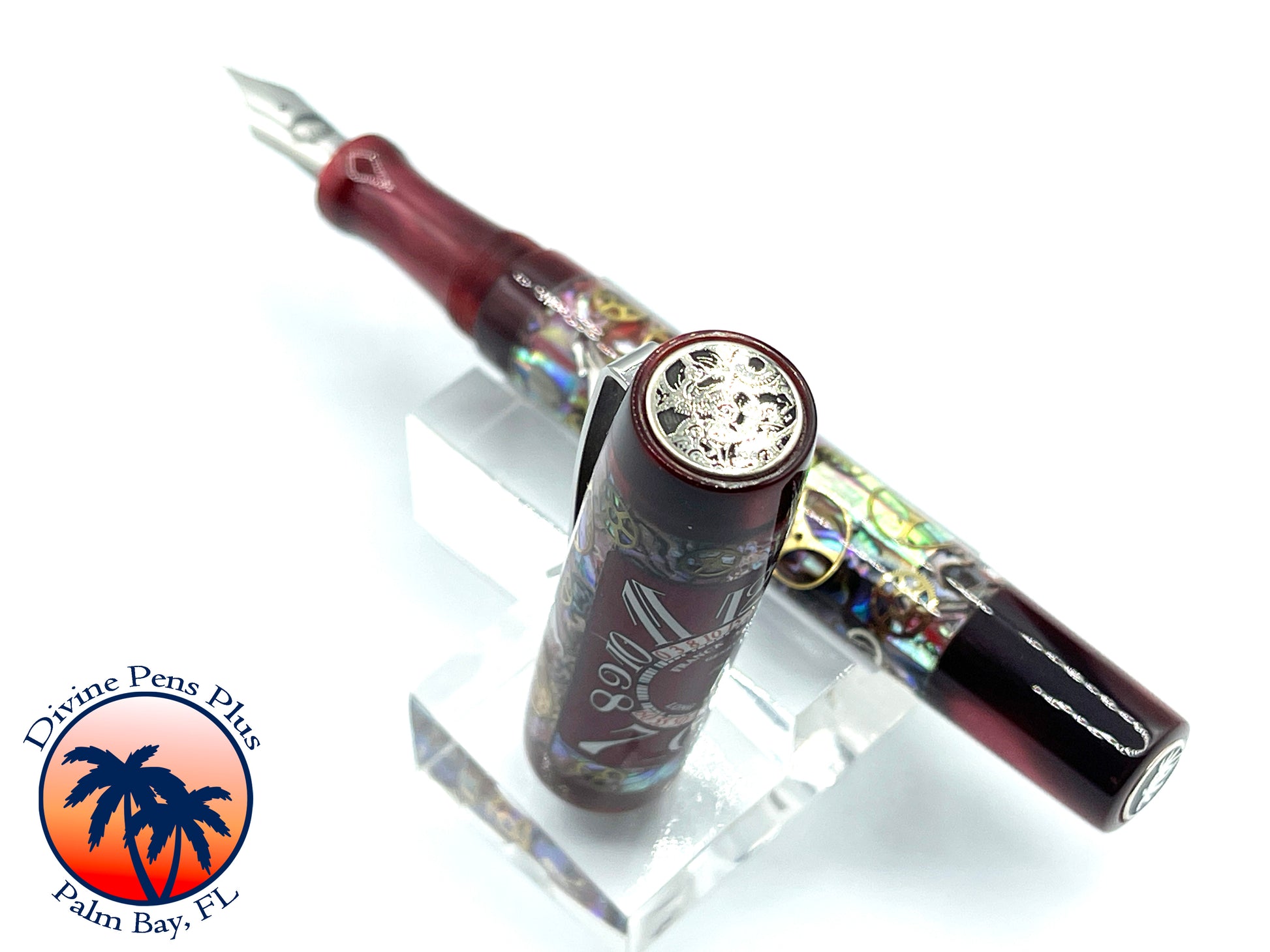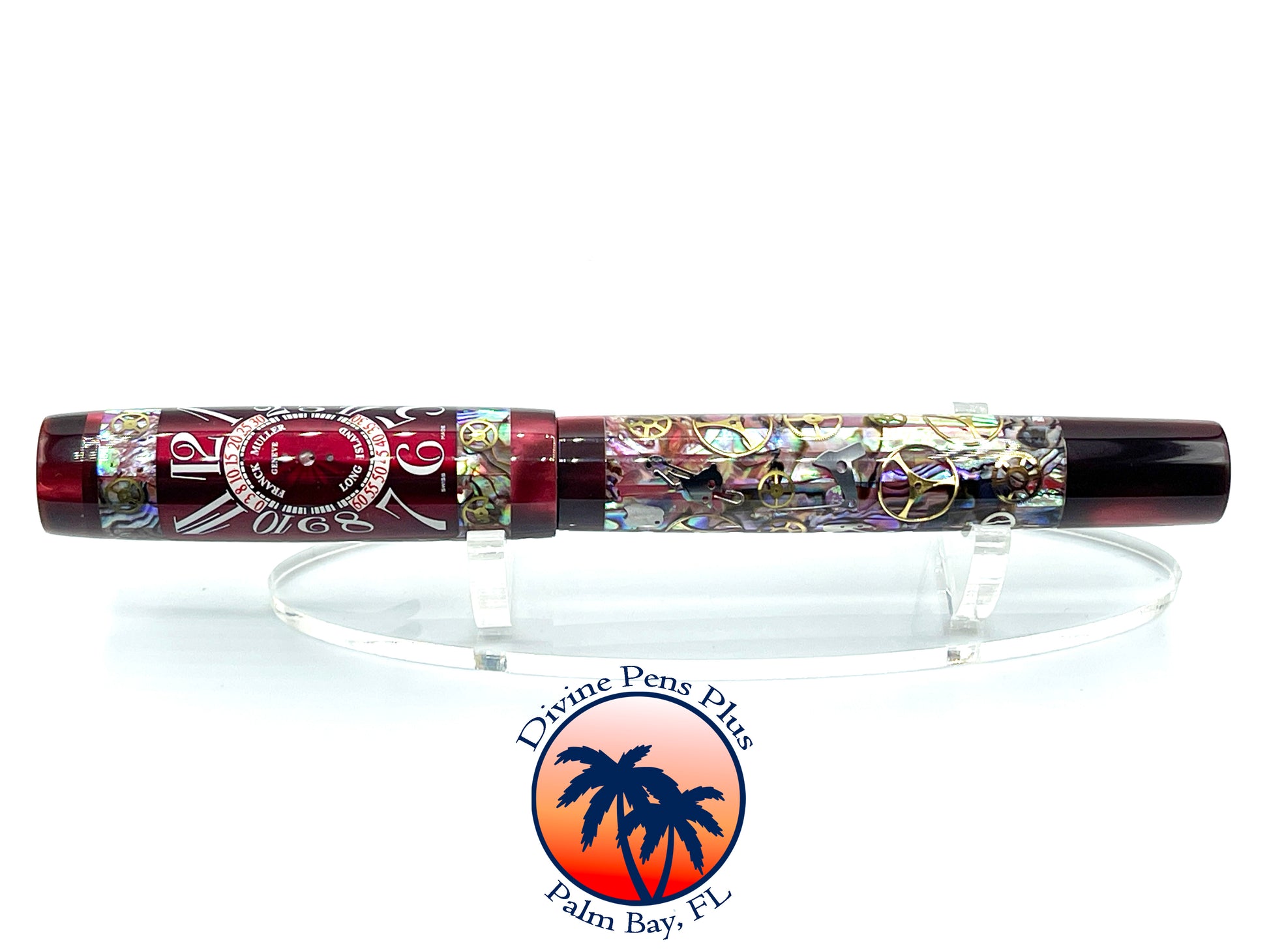 This one is a stunner and personal favorite! The body and cap are custom cast watch parts featuring an actual maroon Franck Mueller watch face and multi-colored abalone background. The section, finial caps and center bands are made with a resin mix called "Red Sky @ Night" from Pourly Controlled. Fitted with a custom stainless steel clip and watch gear engraved nickel silver cabochon on the cap finial and logo engraved nickel silver cabochon on the body finial. Fitted for our branded Bock no. 6 nib, with many nib widths available. Pen comes with one standard international converter. Check out the details of this pen in the video!