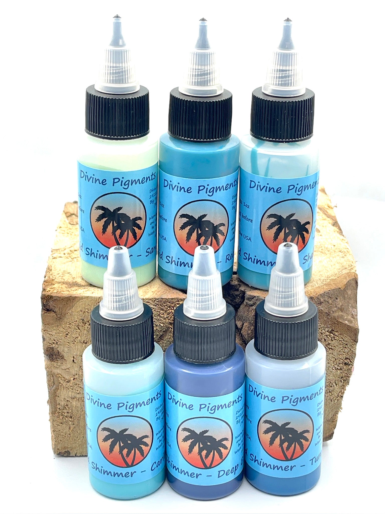 A set of all 6 Liquid Shimmer blue pigments in 1 oz bottles.