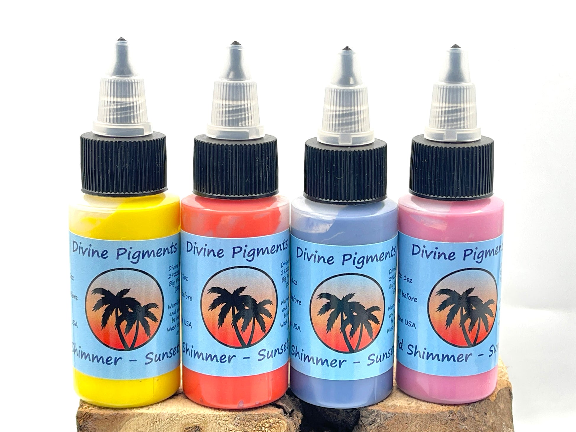 A set of all 4 Liquid Shimmer Sunset color pigments in 1 oz bottles.